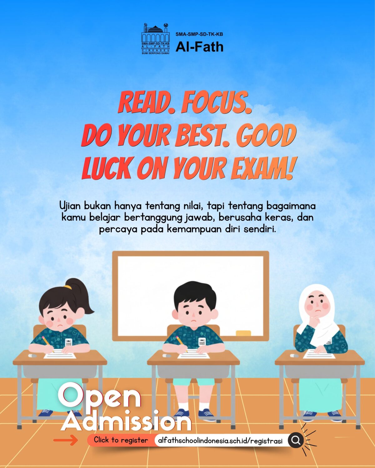 Dengan semangat Read, Focus, and Do Your Best, Sekolah Al-Fath berharap seluruh siswa dapat menjalankan ujian dengan penuh keyakinan dan integritas. Setiap langkah kecil yang mereka lakukan hari ini akan menjadi fondasi penting bagi kesuksesan mereka di masa depan.